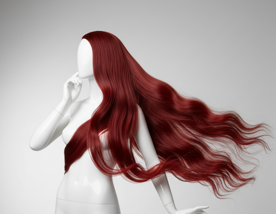 Curly red hair styling mannequin showcasing hair color services at Atelier Hair Salon Milford MA